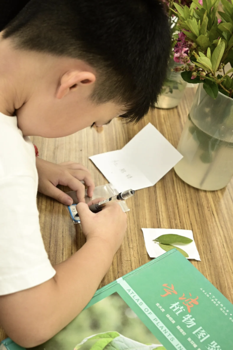 在植物标本室,杨晓东老师团队的研究生为孩子们展示了珍稀植物标本,并讲解了植物的演化与分类知识。他们引导孩子们触摸叶片、观察花朵结构,以此辨别不同植物的特征,让孩子们了解到植物在生态系统中的作用。此外,还指导孩子们学会了制作简易的植物标本。