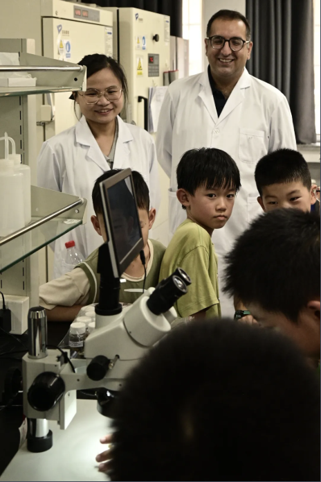 在土壤地理实验室中,高梅香老师团队的研究生引领着孩子们开启了一场“土壤与微生物的秘密对话”。孩子们通过观察土壤样本以及显微镜下的土壤生物,揭开了土壤生态系统多样性的神秘帷幕。不同质地的土壤样本,让孩子们能够直观地感受其物理特性。土壤昆虫标本则展现出一个鲜为人知的微观世界,让孩子们深刻认识到,土壤并非仅仅是“泥土”,而是支撑地下生态网络的“生命基底”。