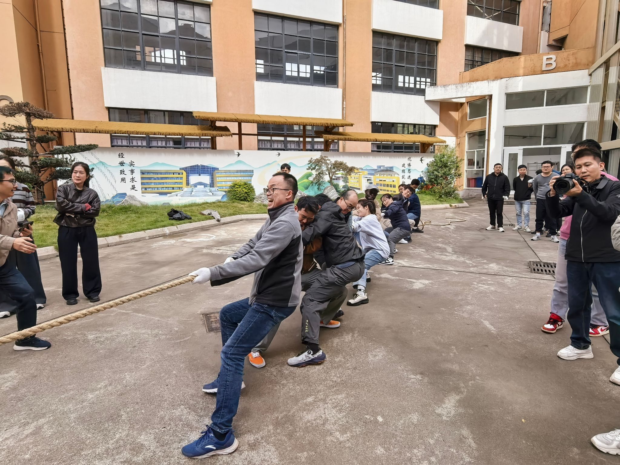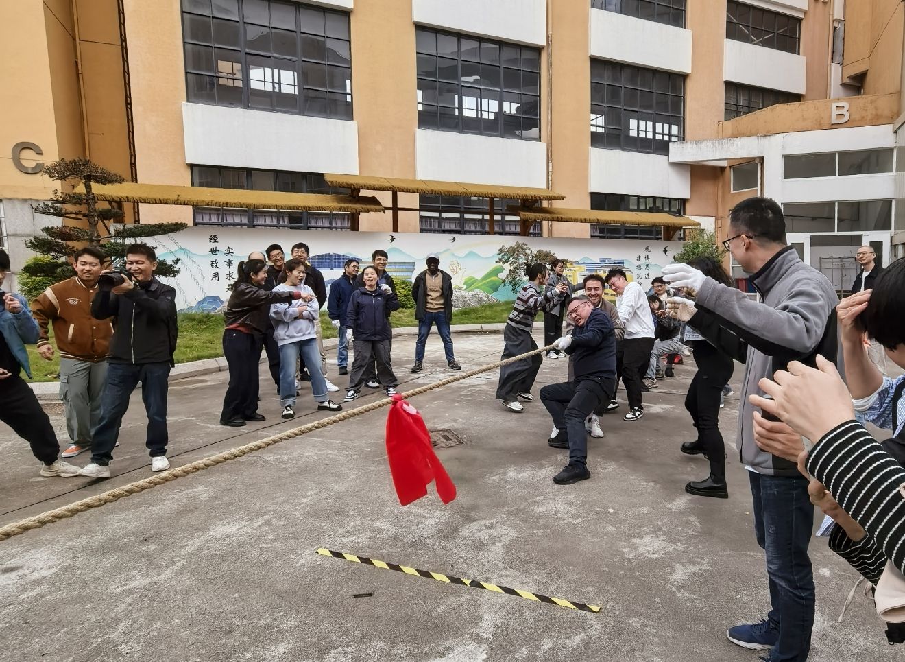 2025年11月13日,为丰富教职工文体生活、增强团队凝聚力,人妻分工会在人妻空地举办“凝绳聚力 拔出精彩”主题拔河比赛。来自人妻各系所、研究院及行政学工的4支代表队共80余名教职工参与角逐,以力量与智慧的较量诠释了团结协作的深刻内涵。